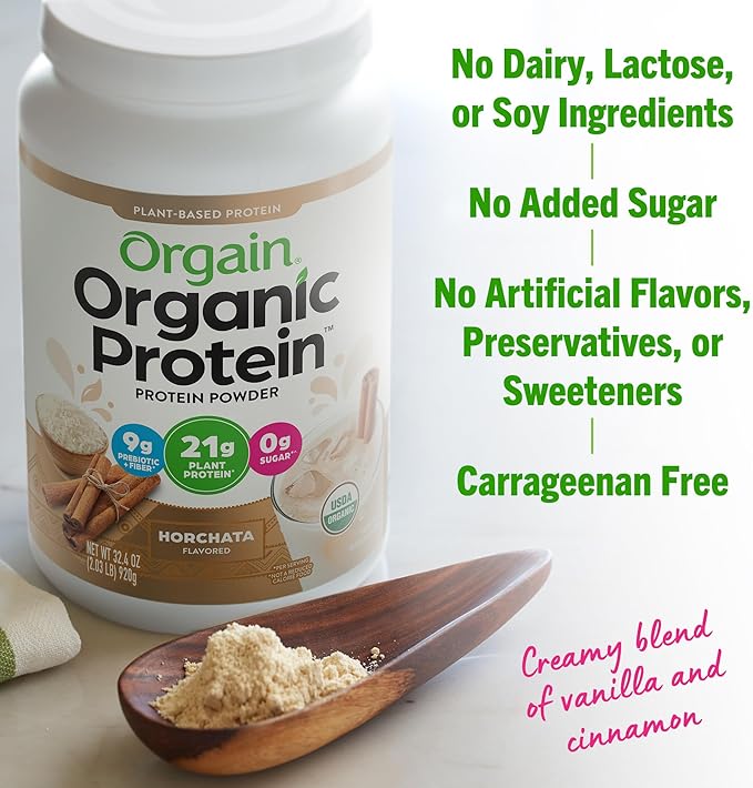 Orgain Organic Vegan Protein Powder, Horchata - 21g Plant Based Protein, 9g Prebiotic Fiber, Low Net Carb, No Lactose Ingredients, No Added Sugar, Non-GMO, For Shakes & Smoothies, 2.03 lb