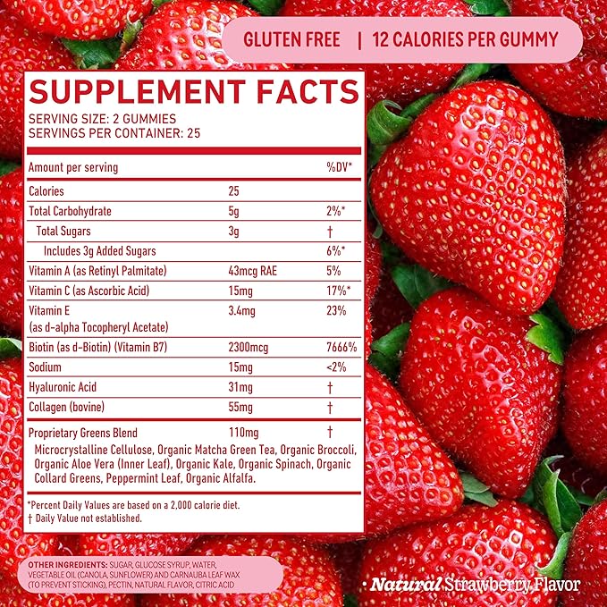 - BOOST HAIR, SKIN, & NAIL HEALTH, 8 ESSENTIAL GREENS, CHOSEN FOR BEAUTY BENEFITS: Each gummy is packed with 8 powerful greens—Spinach, Kale, Aloe Vera, Green Tea, Broccoli, Collard Greens, Peppermint, and Alfalfa—carefully selected to promote skin firmness, enhance elasticity, and provide a daily glow. Enjoy 2-4 gummies daily for radiant results.