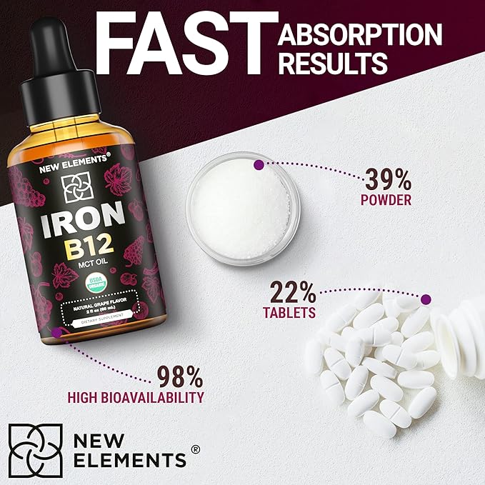 Liquid Iron Supplement for Women & Men with Vitamin B12 5000mcg - Free Blood Builder for Anemia - Liquid Vitamin B12 Drops for Adults with MCT Oil, Natural Grape Flavor, 2 Fl Oz