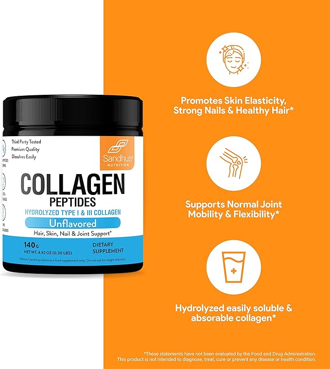 - -SPECIAL FEATURES –Sandhu’s Collagen Peptides Powder is packed, tested, and distributed in the USA; available as unflavored collagen powder in a net weight of 140 g. Contains type-1 collagen which is a vital element for bone, tendon, and connective tissues to support mobility and flexibility.* Type-3 collagen peptides acts as a vital component of our skin and organs.*