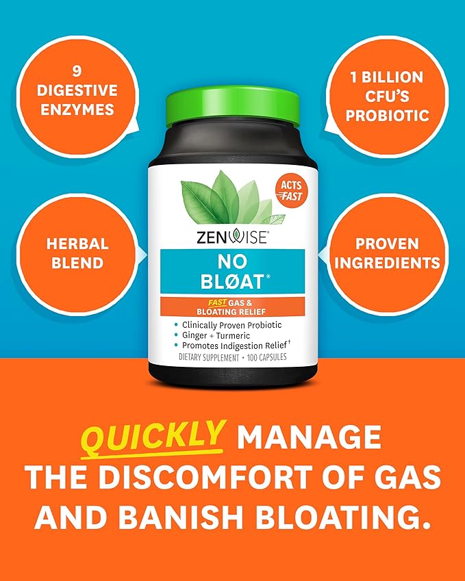 Zenwise Health NO Bloat Probiotics for Women and Men Digestive Health with Ginger, Dandelion, and Lactase, Digestive Enzymes for Gas and Bloating Relief - Vegan Water Retention Pills - 100 CT