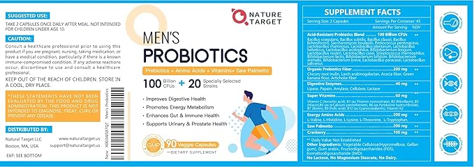NATURE TARGET Probiotics for Men Digestive Health with Enzymes & Prebiotics, 100 Billion CFUs, Men's Probiotics with Saw Palmetto & Cranberry for Prostate & Urinary Tract Health, 90 Veggie Capsules