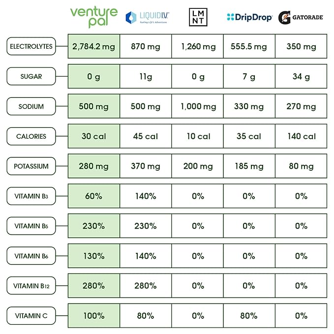 - SUGAR FREE AND OPTIMIZED FORMULA: Everyone knows that sodium plays a key role in maintaining fluid balance. However, most electrolyte mixes on the market are either too salty or too sweet. Venture Pal's Hydration Boost has zero sugar and an optimized sodium level within the daily value recommended by The American Heart Association