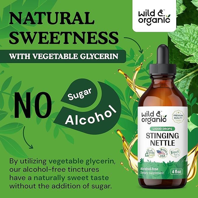 - Sweetness Without Sugar: Enjoy a pleasant supplement experience with Wild & Organic stinging nettle extract, which features a naturally sweet taste. Our nettle root liquid uses glycerin for natural sweetness, with no added sugar.
