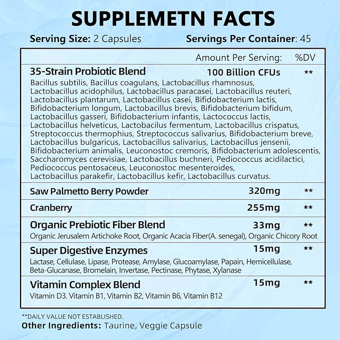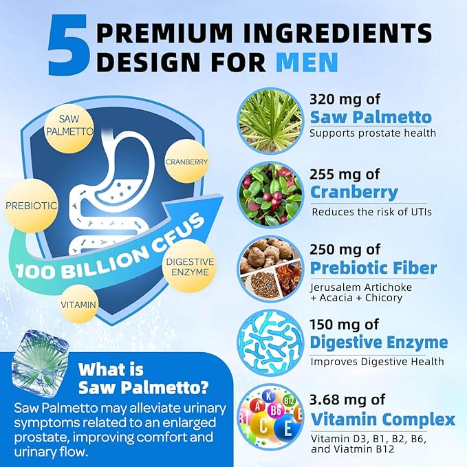 - Men's Probiotic - This probiotics for men includes 100 billion CFUs per serving, adding the saw palmetto, and cranberry for men's prostate health*, to help you experience optimal gut health for men and daily care
