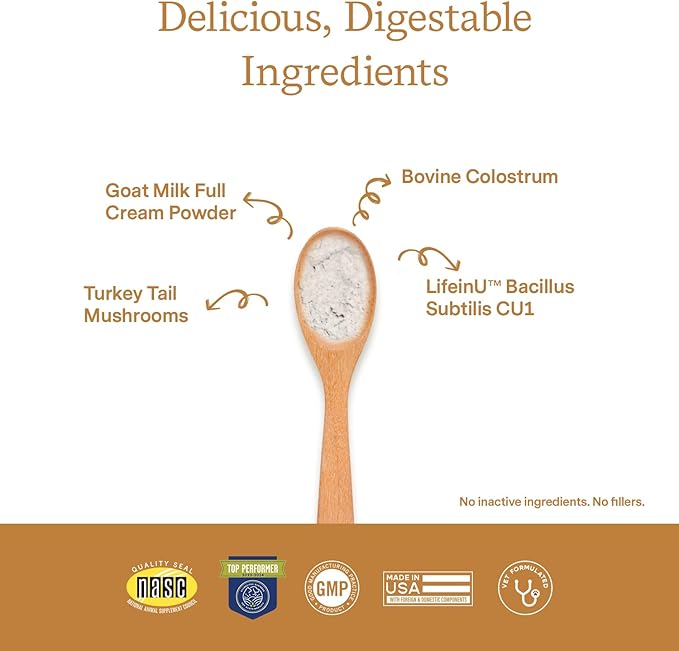 - No fillers: Formulated with Bacillus Subtilis cat probiotic and dog probiotic, as well as colostrum and turkey tail mushroom for immune system regulation; made with full cream goat milk for easy digestion