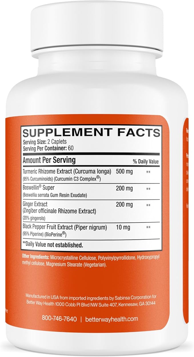 Better Way Health Curcumin Plus - Curcumin C3® Complex + Boswellin® Super + BioPerine® + Ginger - 120 Caplets