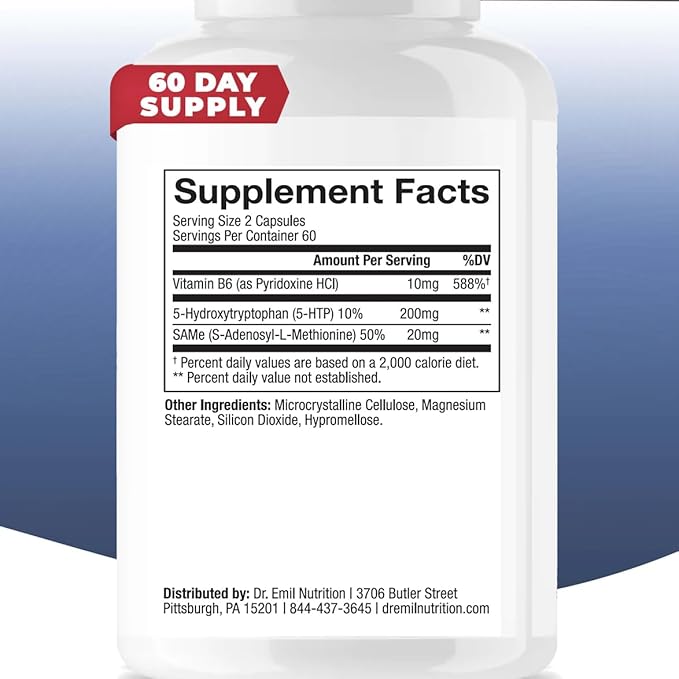 - Primary Supplement Type : DR. EMIL NUTRITION 200 MG 5-HTP Plus with SAM-e for Mood, Stress, and Sleep - 5HTP Supplement with Vitamin B6-120 Vegan Capsules, 60 Servings DR. EMIL NUTRITION 200 MG 5-HTP Plus with SAM-e for Mood, Stress, and Sleep - 5HTP Supplement with Vitamin B6-120 Vegan Capsules, 60 Servings