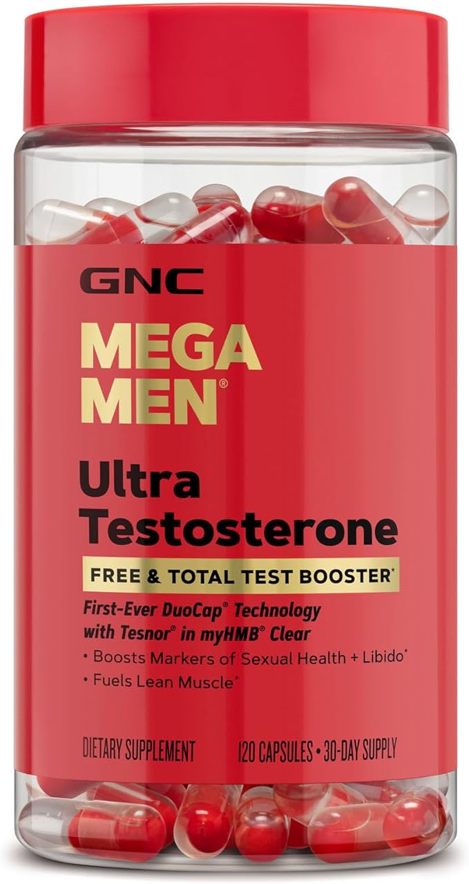 - BOOST TESTOSTERONE LEVELS WITH GNC MEGA MEN ULTRA TESTOSTERONE: Starting at 30 years old, testosterone levels begin to decline by 2–3% in men. If that sounds like a bummer, it is—declining testosterone can negatively impact sexual function, mood, strength, and muscle mass. Increase free and total testosterone with the first-ever clinically studied test booster inside muscle-enhancing liquid HMB.