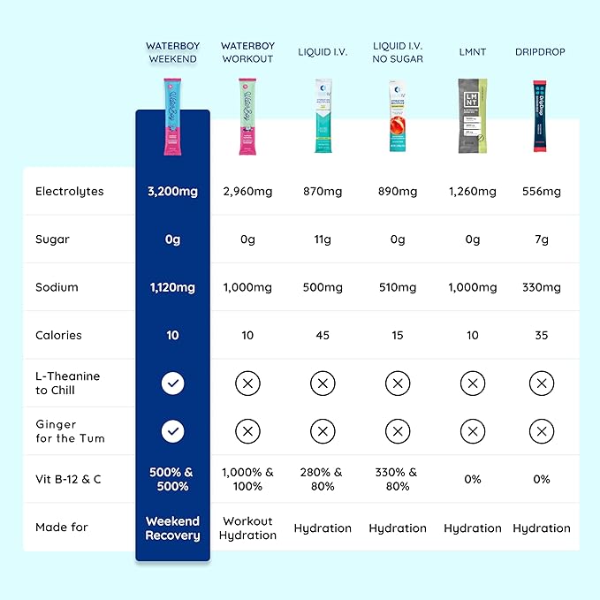 - Product Benefits : Waterboy Weekend Recovery | 3,200mg Electrolyte Powder Packets | Ginger + L-Theanine + Vitamins | No Sugar, All Natural, Gluten Free | 24 Drink Stick Mixes (Lemon Lime) Waterboy Weekend Recovery | 3,200mg Electrolyte Powder Packets | Ginger + L-Theanine + Vitamins | No Sugar, All Natural, Gluten Free | 24 Drink Stick Mixes (Lemon Lime)