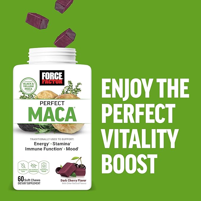 FORCE FACTOR Perfect Maca, Maca Root and DIM Supplement with Saffron to Boost Energy and Mood, with Yellow and Black Maca, Vitamins, Minerals, and Antioxidants, Dark Cherry Flavor, 60 Soft Chews