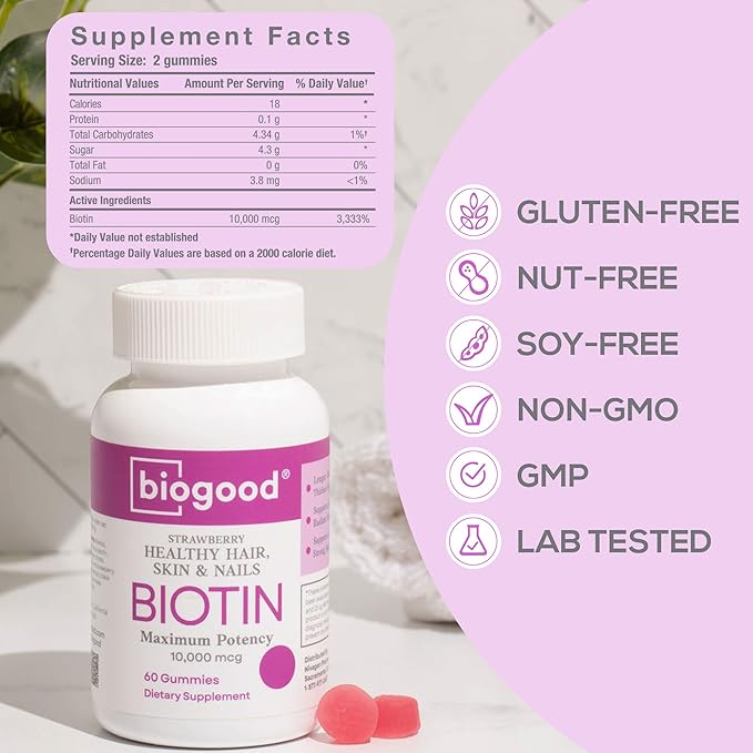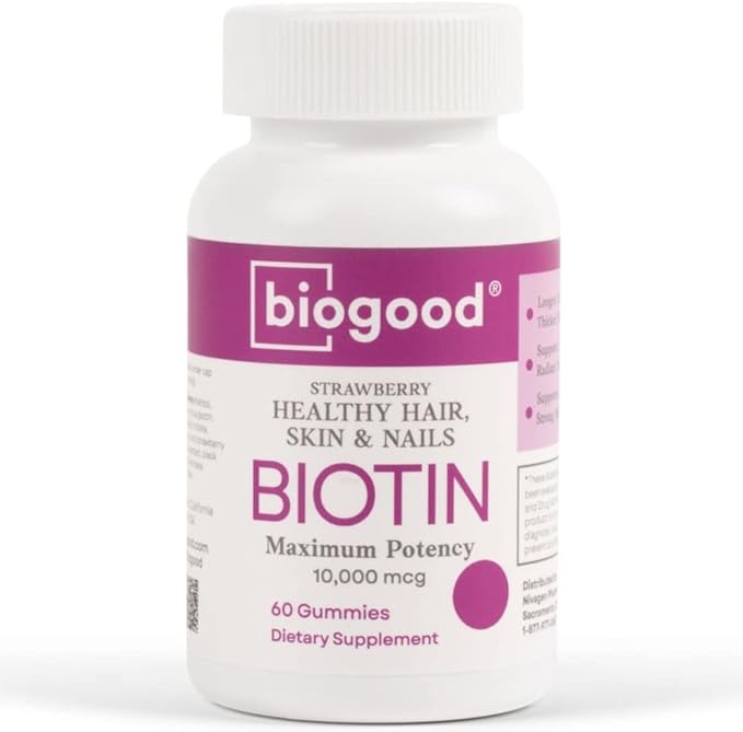 - EMPOWERING TRANSFORMATIONAL BEAUTY: BIOGOOD’s Maximum strength Biotin Gummies promote stronger and thicker feeling hair, clearer and more radiant, and stronger and less brittle nails. Beauty begins with BIOGOOD Biotin Gummies.
