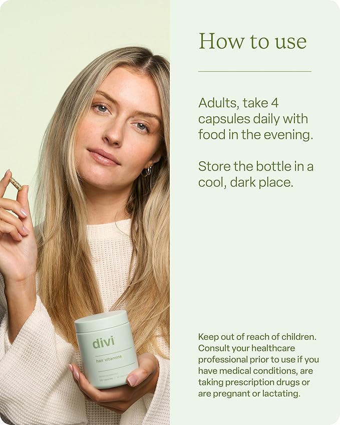 - Primary Supplement Type : divi Hair Vitamins for Women and Men - Made with Clean and Science-Backed Ingredients to Grow + Thicken - Create a Healthy Hair Environment - 30 Day Supply, 120 Count divi Hair Vitamins for Women and Men - Made with Clean and Science-Backed Ingredients to Grow + Thicken - Create a Healthy Hair Environment - 30 Day Supply, 120 Count
