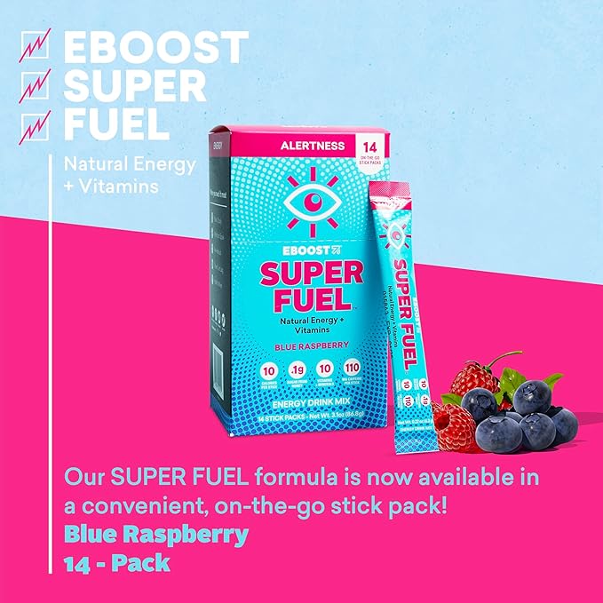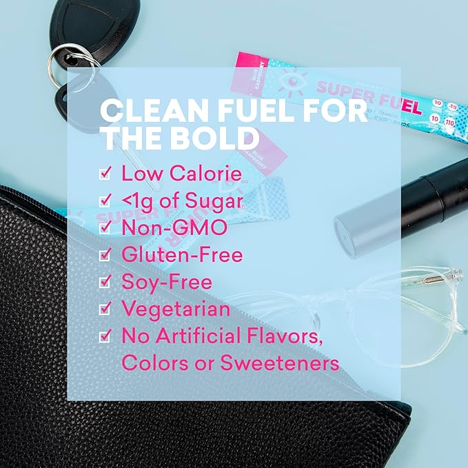 - Fuel up on the fly with SUPER FUEL Powder: a delicious energy boost with only 10 calories per stick. Our on-the-go stick packs feature natural caffeine from green coffee seed and green tea, providing a smooth and sustained lift without jitters or crashes. With 3 mouthwatering flavors to choose from, SUPER FUEL Powder makes staying energized and focused a tasty experience, wherever your day takes you. Flavor Blue Raspberry. 14-Pack