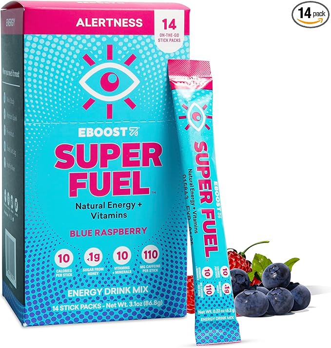 EBOOST Energy Drink Powder, Super Fuel - Blue Raspberry, 14 Packets - Pre-Workout Powder Energy Drink Mix - Natural Energy, L-Tyrosine, L-Theanine & Vitamins - Preworkout for Women & Men to Go