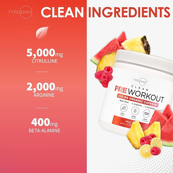 Type Zero Clean Pre Workout (11.3 oz, Fruit Punch) + Beet Root + L-Arginine + L-Citrulline, 2G Arginine, L-Citrulline Malate, Beta A, Sugar Free, Organic Caffeine Preworkout for Men & Women