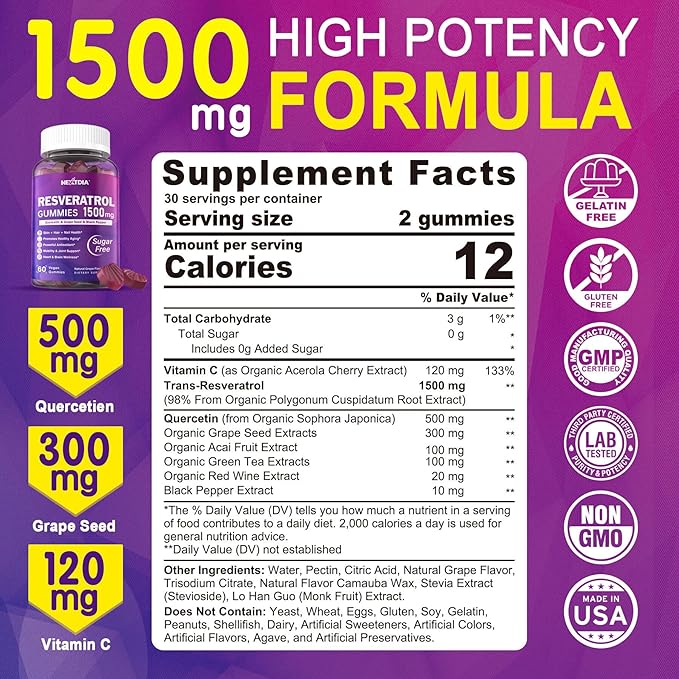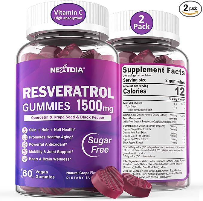 - [Delicious, No-Bitter Resveratrol Supplement]: Sugar-free vegan resveratrol supplement 1500mg - flavored with natural Monk Fruit, Stevia, Grape Extract - Natural grape flavor, easy to chew, non-greasy, non-bitter resveratrol gummies suitable for adult men and women, 2 gummies per day, 2 bottles, 60-day supply, if you keep taking it for a long time, you will be pleasantly surprised!