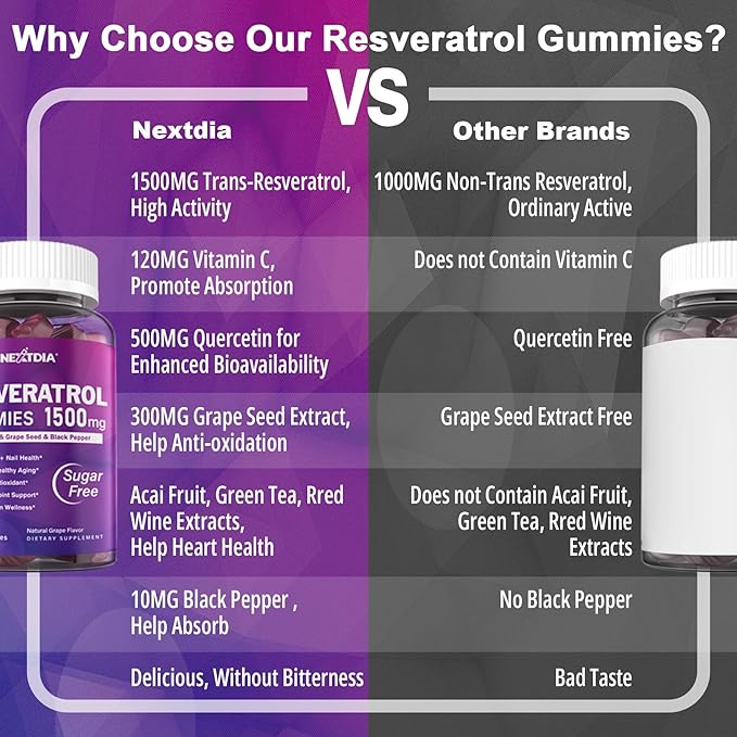 - [8-in-1 Powerful Formula, Natural Combination]: Resveratrol Supplement Gummies 8-in-1 Advanced Formula - Our Resveratrol Supplement contains Quercetin, Organic Green Tea, Acai fruit, Grape Seed, Red Wine and Black Pepper Extracts & Vitamin C etc.7 additional premium ingredients . It helps maximize health benefits and form powerful health bonds. More effective than other brands' single formulas in supporting healthy aging and antioxidant,mobile & joint linkage, and heart and brain health.
