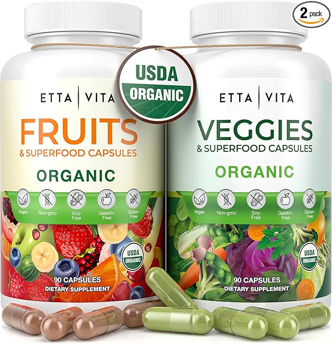 100% Organic Fruits and Veggies Supplement (USDA Organic - Made in USA) 180 Potent Fruits and Vegetable Capsules for Energy Boost & Daily Fruit and Vegetable Vitamins - Vegan, Non-GMO, Gluten-Free