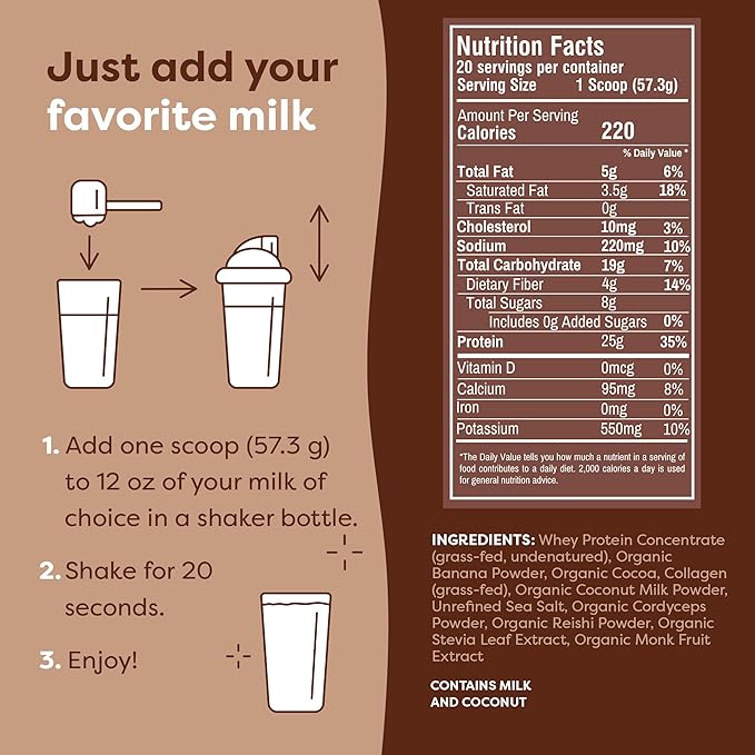 - TOTAL BODY NOURISHMENT: Formulated with non-GMO, minimally processed, and grass-fed, undenatured whey protein, collagen, and added amino acids. Grass-fed bovine collagen peptides (10g per serving) provide extra protein and joint support. Reishi and Cordyceps mushrooms can help increase focus and cognition.