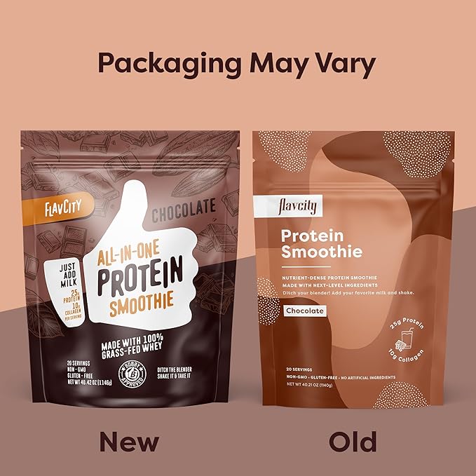 - DITCH THE BLENDER: FlavCity’s Chocolate Protein Smoothie is a delicious and nutrient-dense powder blend of real cocoa and bananas. We’ve simplified the smoothie-making process by incorporating all the high-quality ingredients you love in each scoop — no add-ins needed! With 25g of protein per serving, our complete protein smoothies are sure to be your new go-to post-workout beverage or snack. 20 servings.
