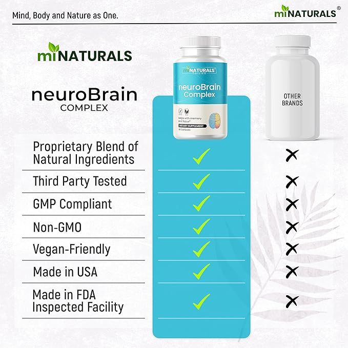 - EXPERTLY FORMULATED: miNATURALS neuroBRAIN Complex is meticulously crafted using an expert formulation. Our team of experienced professionals and scientists have carefully selected and combined a precise blend of ingredients to create a synergistic formula that maximizes its brain-maintenance benefits. Each ingredient is chosen for its specific cognitive-enhancing properties, ensuring that you receive the optimal support for memory, focus, and overall brain health.