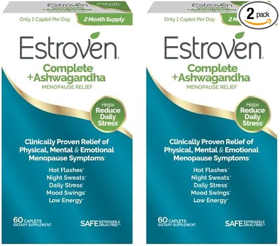 Estroven Complete + Ashwagandha Multi-Symptom Menopause Supplement for Women - Clinically Proven Ingredients Provide Menopause Relief & Night Sweats + Hot Flash Relief* - 4 Month Supply (Pack of 2)