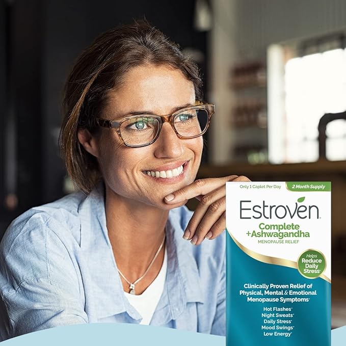 - As if menopause symptoms weren't bad enough, daily stress makes symptoms like hot flashes feel even more severe. At the same time, the decline of estrogen with menopause increases stress and irritability creating a vicious cycle of stress and menopause symptoms. Help stop the vicious cycle with Estroven Complete + Ashwagandha. Ashwagandha is a well-known adaptogen that lowers perception of stress while rhapontic rhubarb extract mitigates the loss of estrogen with menopause.*