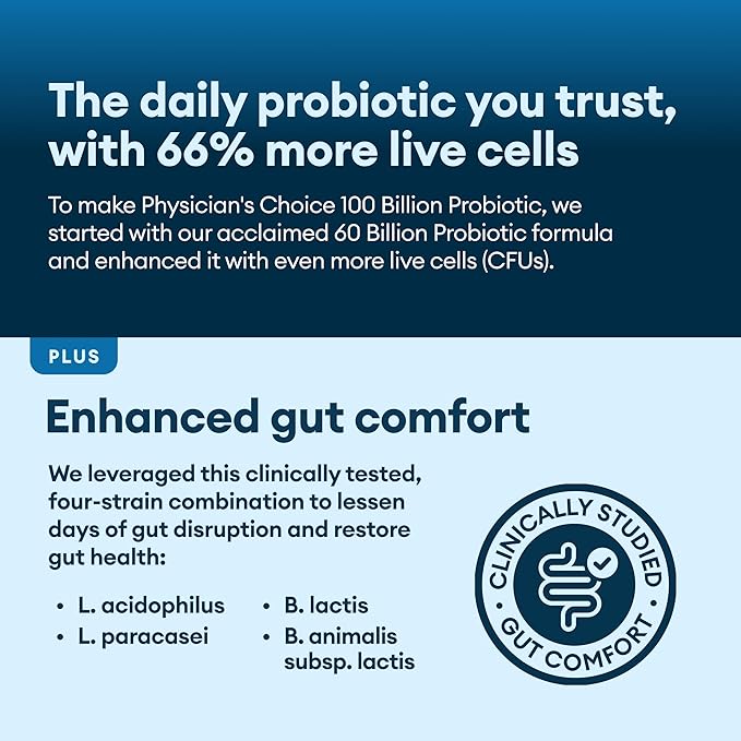 - Extra-Strength Gut Comfort Probiotic: Our 100 Billion Probiotic for women & men is the optimal formula to promote daily gut comfort & replenish healthy bacteria. The smart choice to give you power over your gut health so you can live comfortably.