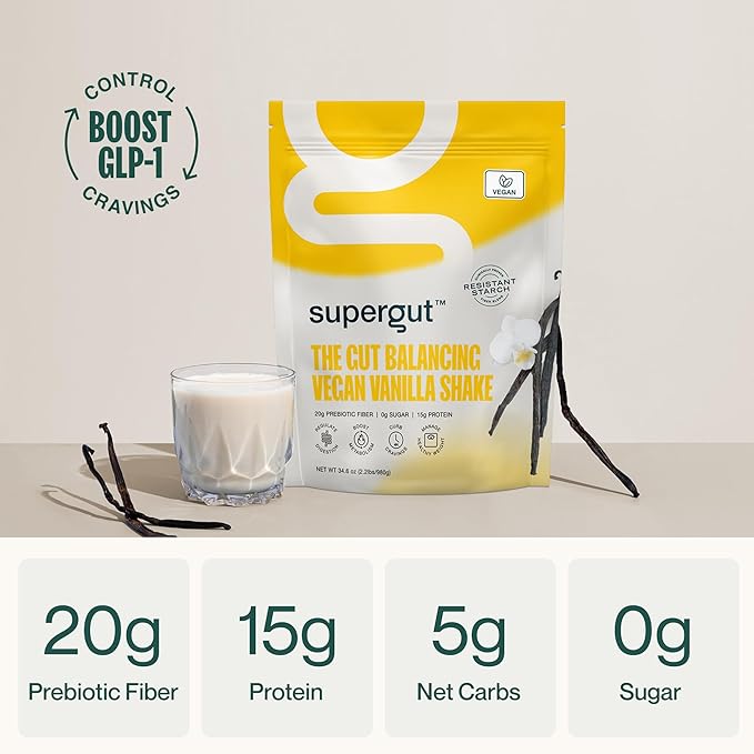 - Gut Goodness in Each Shake: Hit your appetite's off switch with Supergut’s Gut Healthy Prebiotic Shake. Each delicious shake is packed with 20 grams of prebiotic fiber, 15 grams of protein, less than 7 grams of net carbs, and less than 1 gram of sugar. It supports a healthy gut while helping you feel nourished and satisfied for longer. Vegan Vanilla flavor.