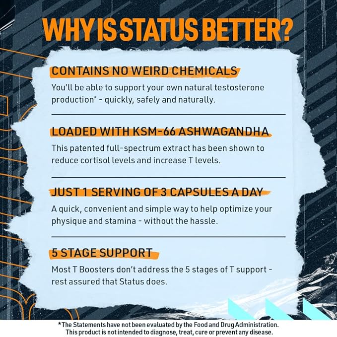 - FULLY DOSED - Backed by years of research and development, Status is formulated with full doses of scientifically validated key ingredients shown to boost testosterone levels and even combat estrogen.