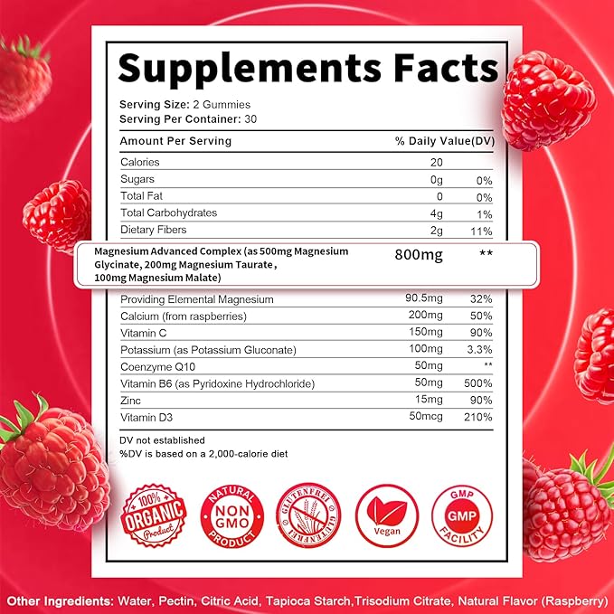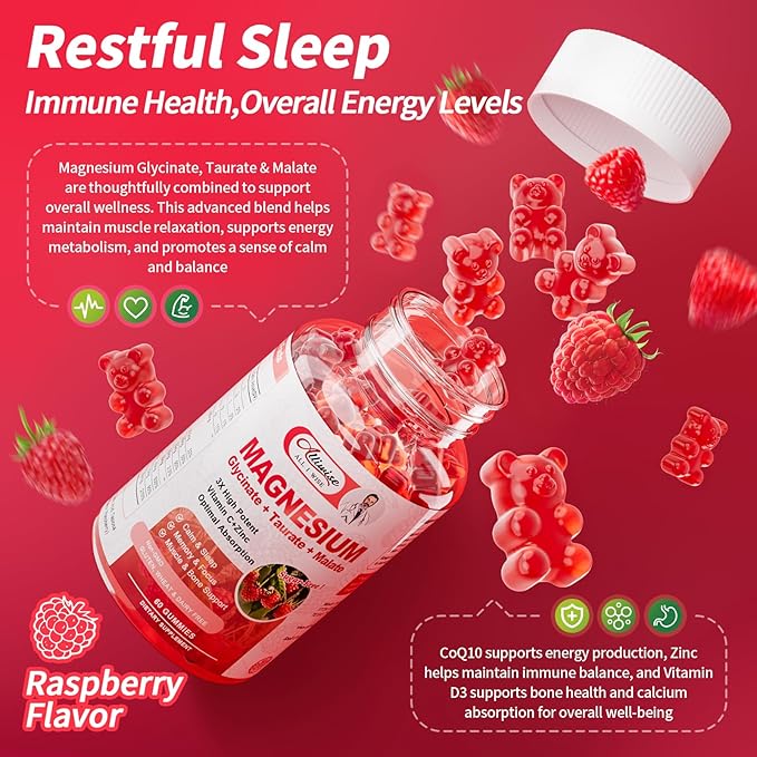- Restore Your Original Rhythm: Our magnesium glycinate malate gummies not only help replenish magnesium deficiency but also assist you in returning to your natural, calm, and healthy rhythm amidst a busy life. Added Vitamin C and Zinc work together to support energy production and collagen synthesis. Each bottle of Raspberry Gummies is compact and easy to carry, containing 60 vegan calcium magnesium supplements. Just take 2 gummies per day to enjoy a 2-month supply of energy anytime.