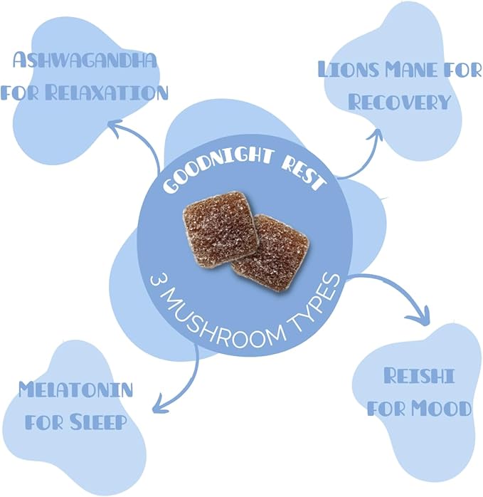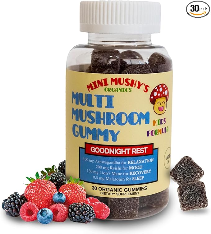 - The Power of Mushrooms: Unleash the power of one of Mother Nature's greatest superfoods - mushrooms! Our Goodnight Rest gummies are holistically balanced to support your child's nighttime well-being. They include 100mg of Ashwagandha for relaxation, 200mg of Reishi to support mood, 150mg of Lion's Mane for recovery, and 0.5mg of Melatonin to support your child's sleep.
