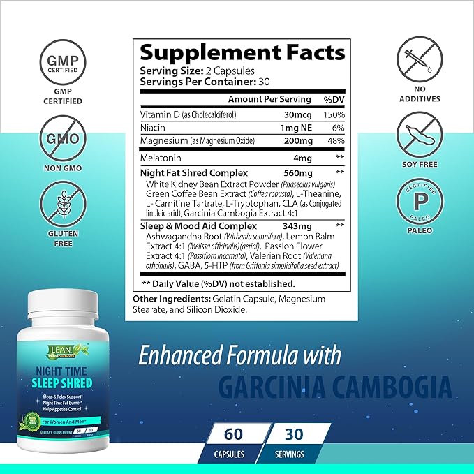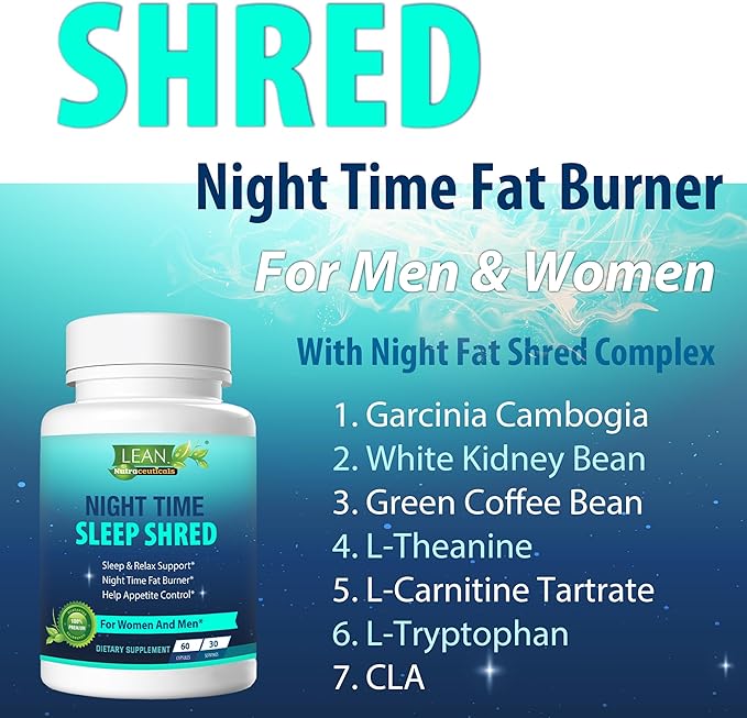 - NIGHT TIME FAT BURNER: Thermogenic night time fat burner (quemador de grasa) for women weight loss and fat burner for men women with Garcinia Cambogia, White Kidney Bean, Green Coffee Bean, L-Theanine, L-Carnitine Tartrate, L-Tryptophan, CLA