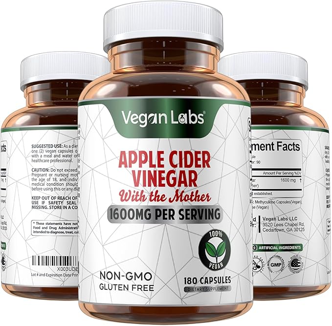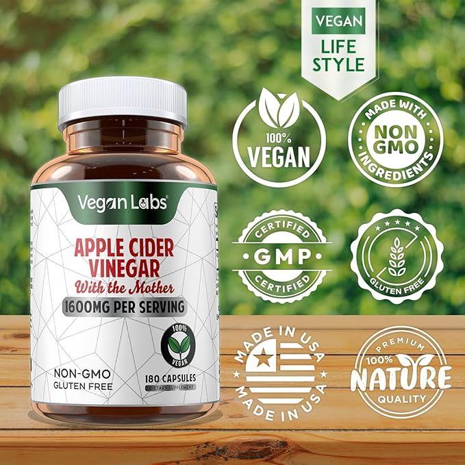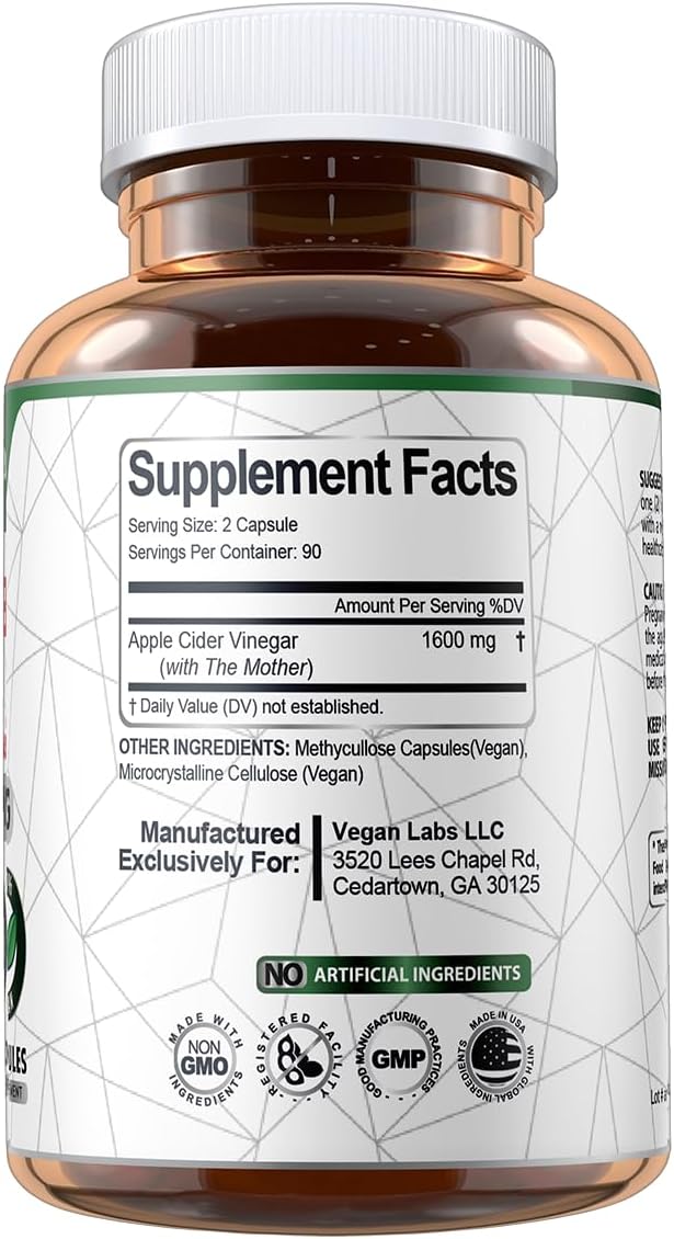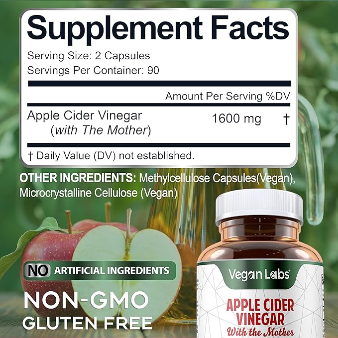 - Apple Cider Vinegar with The Mother- 1600mg pure ACV per serving, 180 Vegan Capsules (3 Month Supply) Supports detox and healthy digestion