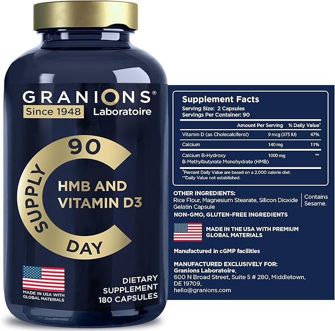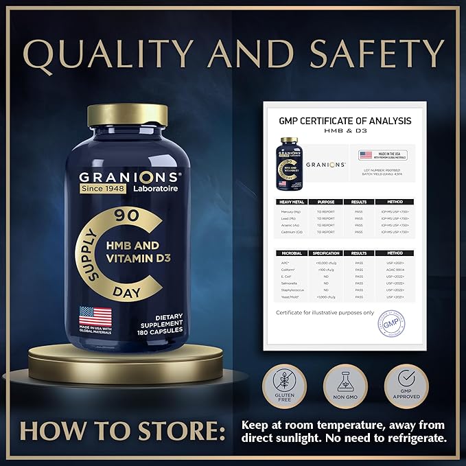 - QUALITY AND TRUST - Manufactured by Granions Laboratoire, a trusted name in supplements, our HMB and Vitamin D3 supplement is cGMP approved and produced under strict quality control standards.