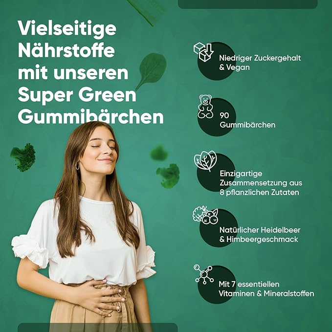 - NATURAL BLUEBERRY & RASPBERRY FLAVOR - Enjoy a delightful natural blueberry and raspberry flavor in every gummy. With low sugar and a gelatin-free formula, these gummies are a delicious way to support your health. The super green gummies do not taste bitter or feel sticky in your teeth. Enjoy our easy-to-take supplement with no aftertaste or sour burps.
