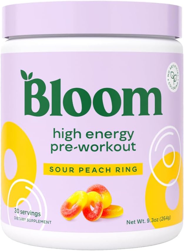 Bloom Nutrition High Energy Pre Workout Powder, Amino Energy with Beta Alanine, Ginseng & L Tyrosine, Natural Caffeine Powder from Green Tea Extract, Sugar Free & Keto Drink Mix (Sour Peach Ring)