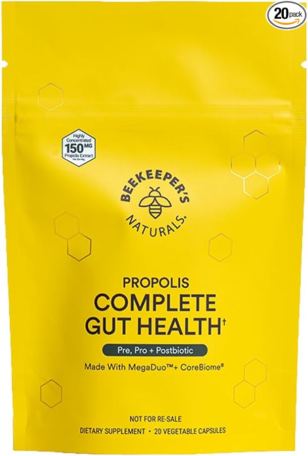 - Flavor : Beekeeper's Naturals Complete Gut Health, 3-in-1 Prebiotic, Postbiotic, Probiotics for Digestive Health & Bloating Relief for Women & Men, Propolis Powered, Gluten-Free Vegan Capsules, 20ct Beekeeper's Naturals Complete Gut Health, 3-in-1 Prebiotic, Postbiotic, Probiotics for Digestive Health & Bloating Relief for Women & Men, Propolis Powered, Gluten-Free Vegan C… See more