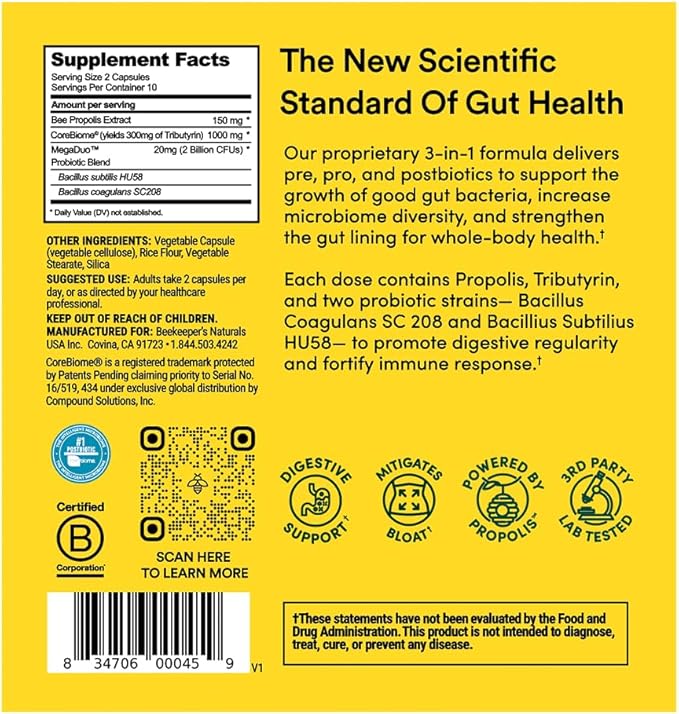 - Product Benefits : Beekeeper's Naturals Complete Gut Health, 3-in-1 Prebiotic, Postbiotic, Probiotics for Digestive Health & Bloating Relief for Women & Men, Propolis Powered, Gluten-Free Vegan Capsules, 20ct Beekeeper's Naturals Complete Gut Health, 3-in-1 Prebiotic, Postbiotic, Probiotics for Digestive Health & Bloating Relief for Women & Men, Propolis Powered, Gluten-Free Vegan C… See more