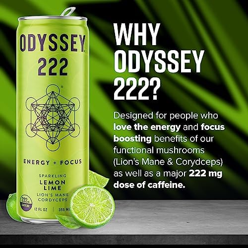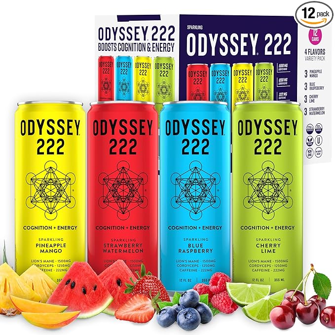 Odyssey 222 Energy Drink, Pre Workout, 222mg Caffeine, Clean Energy Drinks, L Theanine, Lions Mane, Cordyceps & Green Tea for Energy, Focus & Mood Boost, Low Calorie, Variety Pack, 12 Fl oz, 12 Pack