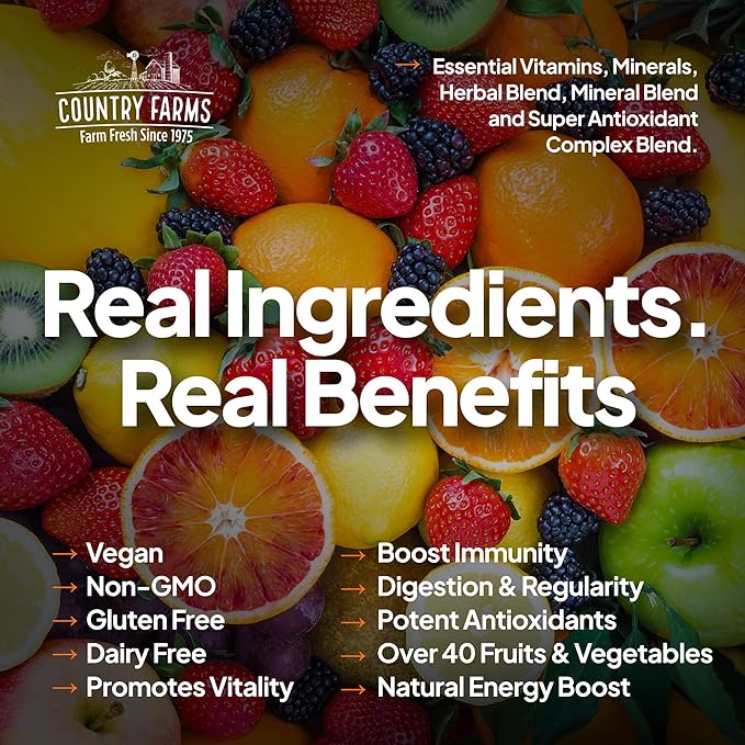 - OVER 40 FRUITS & VEGETABLES. Only the finest ingredients Mother Nature has to offer are selected for Country Farms Morning Liquid Multivitamin. Formulated with over 40 fruits and vegetables to support overall health, memory function, and healthy digestion.