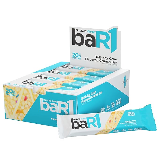 Rule 1 baR1 Crunch Bar - On-The-Go Convenient Protein Snack Bars with 20g Premium Protein, Naturally-Packed with EAAs/BCAAs, Hunger-Filling Fiber (12 Count Box, Birthday Cake)