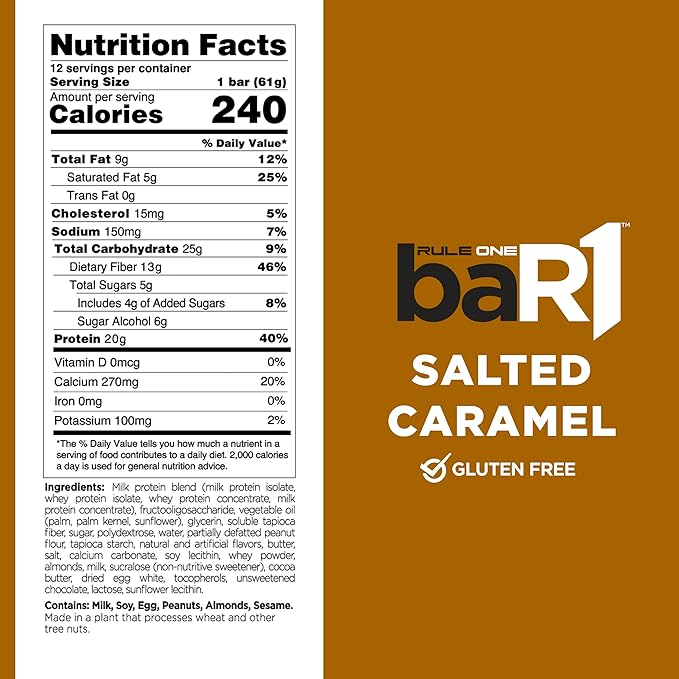 Rule 1 baR1 Crunch Bar - On-The-Go Convenient Protein Snack Bars with 20g Premium Protein, Naturally-Packed with EAAs/BCAAs, Hunger-Filling Fiber (12 Count Box, Salted Caramel)