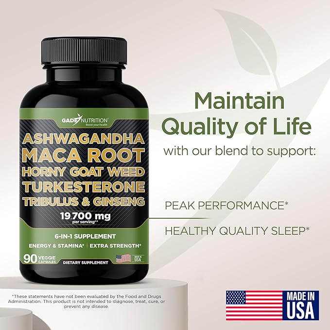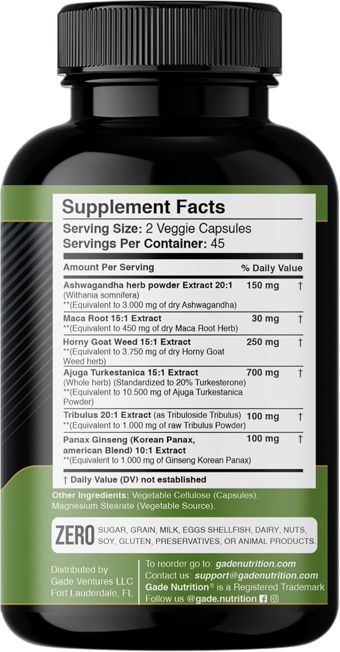 - EXTRA STRENGTH FORMULA: The ultimate Ashwagandha supplements with Maca Root Capsules provide six full-dose herbal supplements in a convenient dosage of two capsules. Gade Nutrition blend is one of the market's most complete supplements, a potent blend with Ashwagandha, Maca Root, Horny Goat Weed, Turkesterone, Tribulus, and Ginseng