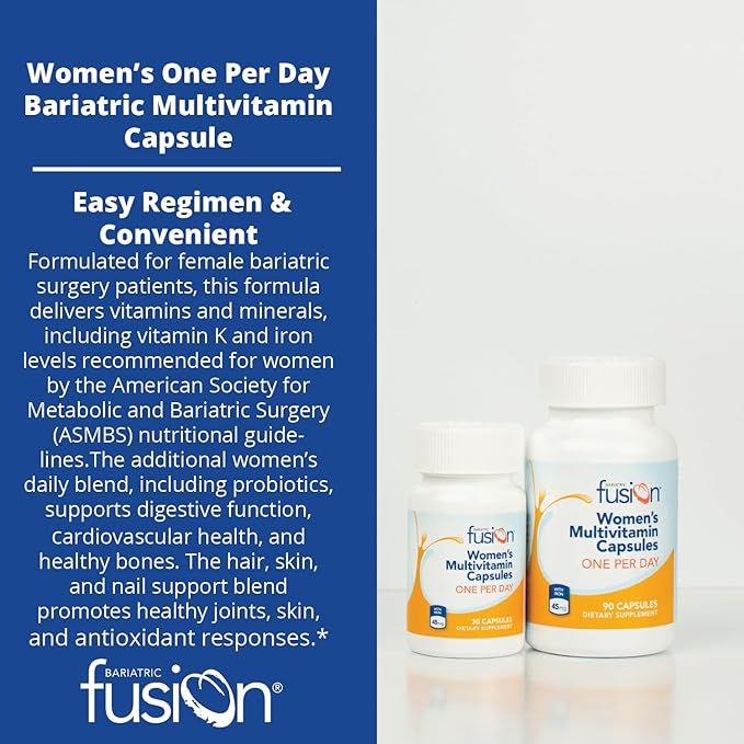 - Premium Bariatric Women Formulation: Our Once daily bariatric multivitamin for women with Iron is the premium supplement for female Bariatric Patients. Each easy to swallow capsule meets or exceeds ASMBS guidelines. The additional women’s daily blend, including probiotics, supports digestive function, cardiovascular health, and healthy bones. The hair, skin, and nail support blend promotes healthy joints, skin, and antioxidant responses.*