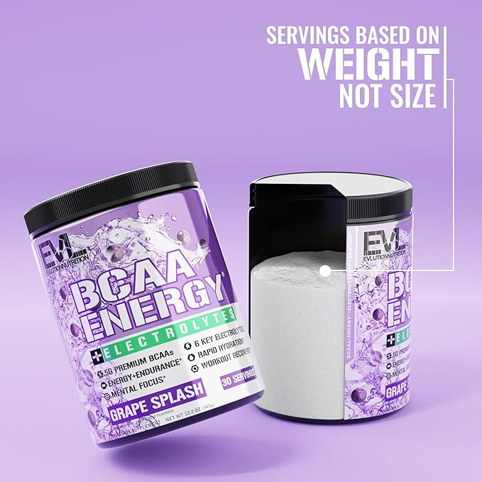 EVL BCAAs Amino Acids Powder - BCAA Energy Pre Workout Powder for Muscle Recovery Lean Growth and Endurance - Rehydrating BCAA Powder Post Workout Recovery Drink with 6 Key Electrolytes - Grape Splash
