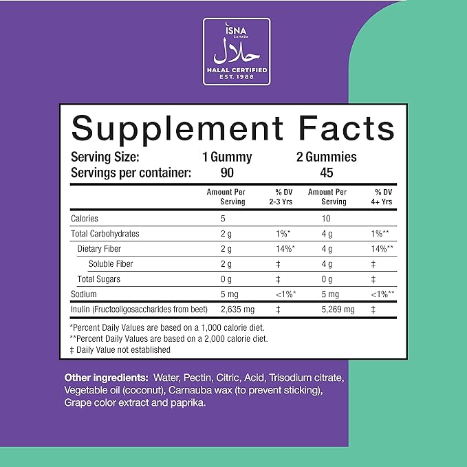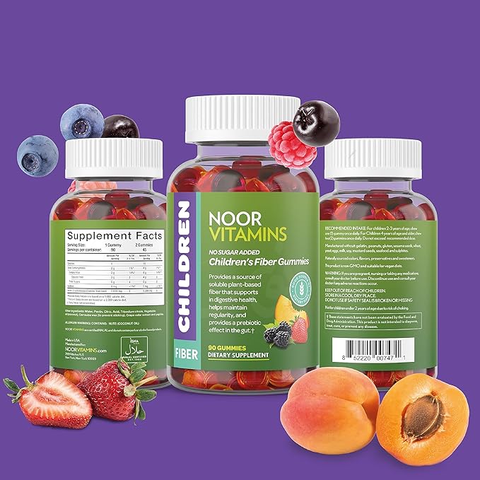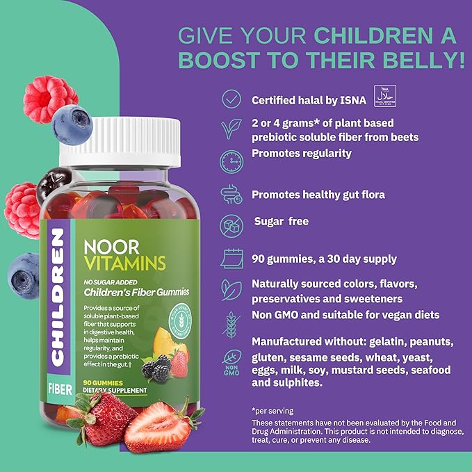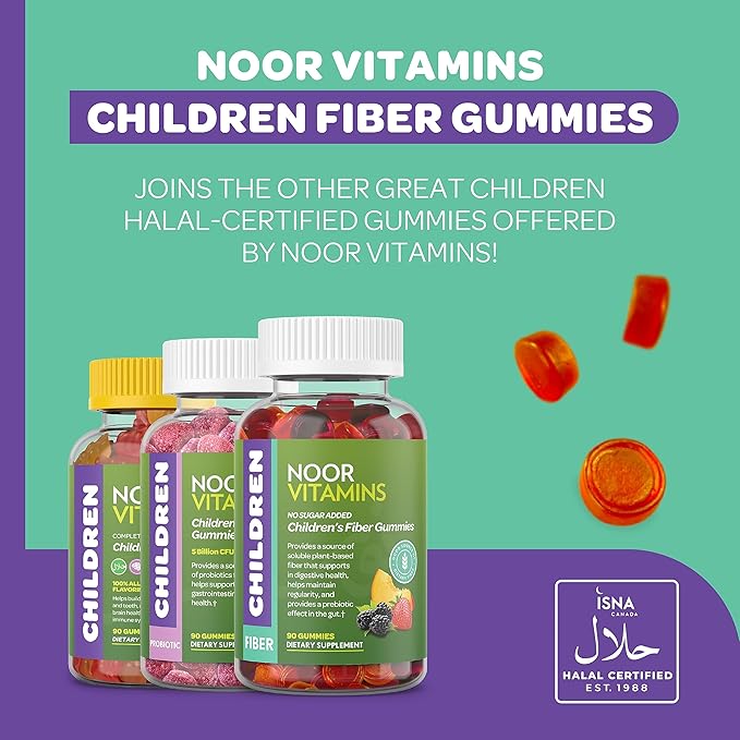 Noor Vitamins Halal Children Fiber Gummy with Prebiotic Plant Based Fiber; Sugar Free, Non-GMO, Gluten Free, Vegan Friendly Gelatin Free Halal Vitamins - 90 Count