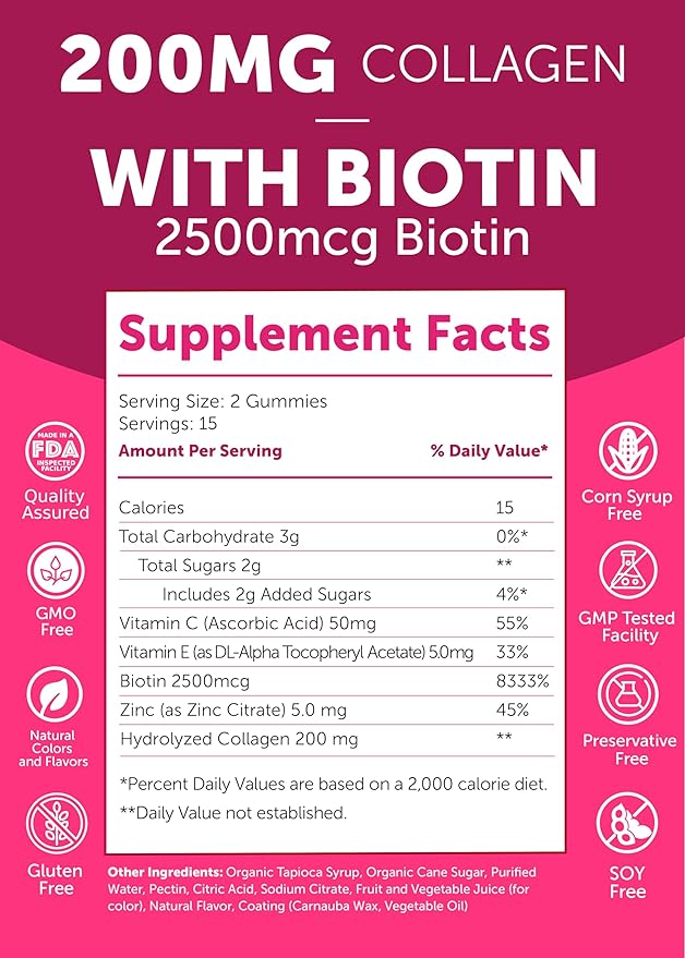 Collagen Gummies for Women and Men with Biotin Zinc Vitamin C and E - Anti Aging, Hair Growth, Skin Care Collagen Supplements - Non-GMO, Gluten Free - 30 Collagen Gummy Vitamins - 15 Days Supply