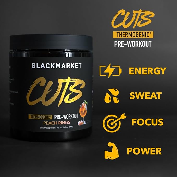 BLACKMARKET CUTS Pre Workout - Flavored Energy Powdered Drink Mix for Men & Women, Great for Muscle Definition, Thermogenic, Creatine Free, (Peach Ring, 30 Servings)